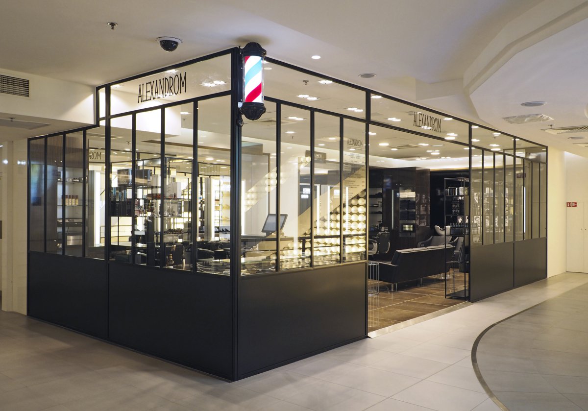 Alexandrom s’installe durablement aux Galeries Lafayette Haussmann. Ce salon imaginé par la maison Alexandre de Paris est dédié aux hommes, et leur propose coupes et entretien de la barbe. Il s’était installé en pop-up éphémère cet hiver. Le coiffeur-barbier reste et s’agrandit au 1er étage du magasin de l’Homme dans un espace de 53 m² qui accueille 5 sièges de coiffeur-barbier Takara Belmont en cuir noir, 2 bacs et un discret espace de coloration. Le plan de travail est en granit noir, le sol est en marbre «Emperador » de couleur bronze, le mobilier en ébène de Madagascar. Au centre, trône un canapé cuir vintage 4 places circa 70, autour duquel se positionnent deux tables basses Minotti. Un chariot d’hôtel tient lieu de vestiaire. Le forfait shampooing-coupe-coiffage est à 39 euros.