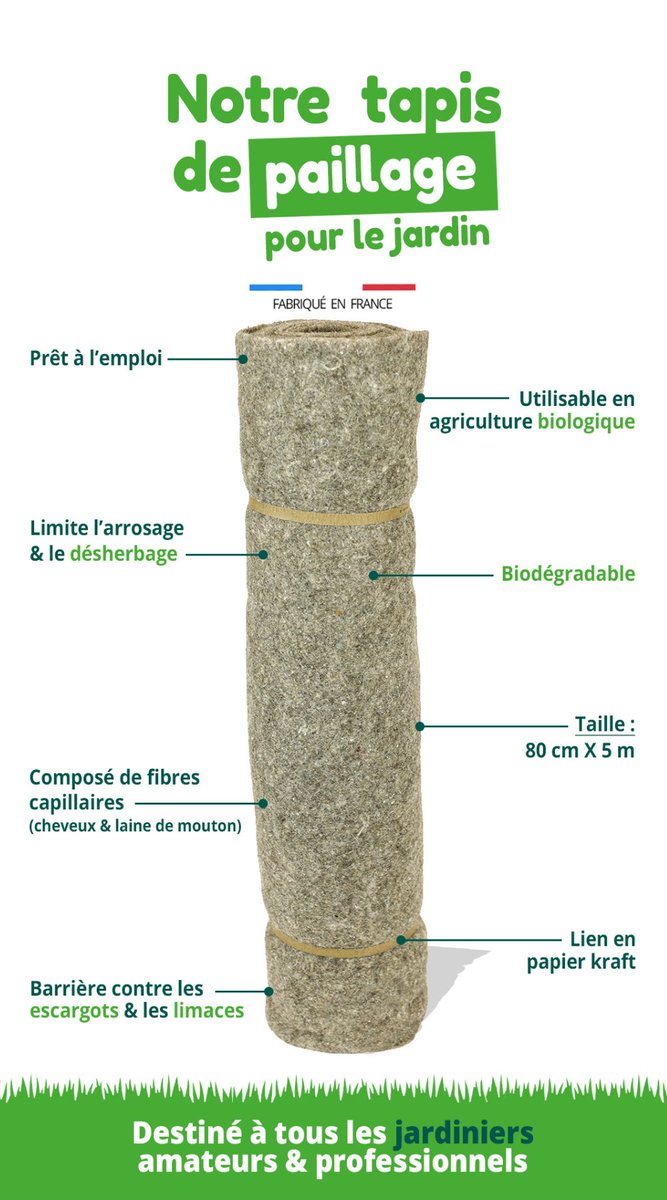 La filière de recyclage de cheveux Capillum propose de produire des tapis de paillage biodégradables en cheveux recyclés. Souvent réalisés avec des bâches plastiques, ces paillages permettent de réduire la consommation d’eau et de limiter la pousse des mauvaises herbes. Capillum a lancé le 8 avril une campagne de financement participatif sur Kiss Kiss Bank pour récolter le minimum de 7000 euros nécessaires au lancement du projet et à son développement .