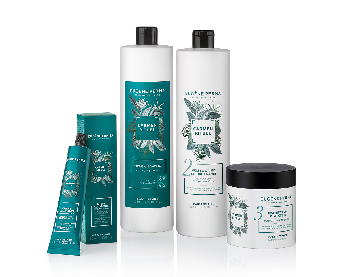 Eugène Perma ne tourne pas 100% naturel mais marque tout de même cette fin d’année avec un lancement majeur. Carmen Rituel, avec 45 nuances, est ainsi formulé avec 95% d’ingrédients d’origine naturelle et surtout sans résorcine, sans ammoniaque, sans PPD (ce qui réduit le risque allergique), sans huiles minérales et avec 20% d’huiles végétales biologiques. La couverture va jusqu’à 100% des cheveux blancs avec un éclaircissement jusqu’à 3 tons. Le service se décompose en trois étapes, la coloration elle-même puis un nettoyage et un rééquilibrage avant d’achever le rituel par une phase améliorant la cosméticité. Tous les emballages sont recyclables.
