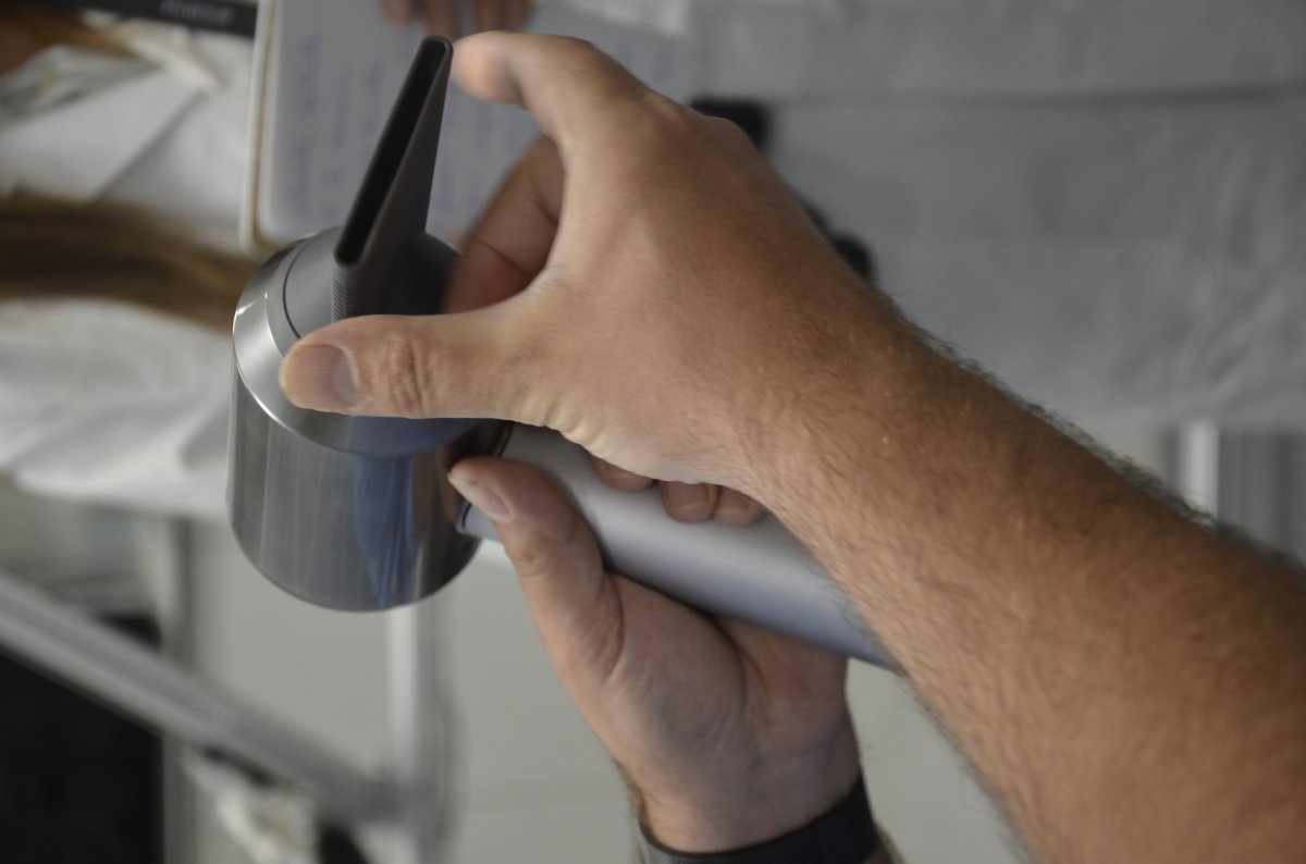 C’est à l’occasion de l’ouverture aux médias de son campus britannique ultra secret que Dyson a dévoilé son prochain sèche-cheveux, le Supersonic édition professionnelle. Fort du succès d’estime du premier, y compris auprès des professionnels, absolument pas visés au départ, l’entreprise a revu sa copie pour l’adapter. La précision du minuscule moteur tournant à très haute vitesse (10 000 tours/mn) dans le manche le rendant très sensible aux poussières du salon, c’est le filtre, démontable, qui a été repensé pour cette « professional edition » du Supersonic, testée par 400 coiffeurs dans 80 salons ! Au menu, 3 vitesses de flux, 4 températures avec un maximum régulé électroniquement ne dépassant pas les 120°C, la poignée disposant également d’une touche air froid. L’embout a été revu pour plus de précision de flux et sa tenue magnétique renforcée ; le fil a été allongé et la garantie portée à 2 ans. Le sèche-cheveux Supersonic avait déjà impliqué quatre années pour la conception de l’appareil ainsi que pour l’analyse de la structure du cheveu. Cette «professional edition» a nécessité deux ans de plus, avec 570 retours en analyse, dont 85 rien que pour le nouveau filtre démontable. Le moteur, positionné dans la poignée, pèse 50 g. Le réglage électronique de la température est affiné via 20 contrôles du capteur par seconde. Le flux d’air, dévié d’un angle de 20°, permet d’éviter de casser le poignet à l’usage. Reste à débourser environ 3 à 4 fois le prix d’un sèche-cheveux professionnel classique pour acquérir cet outil efficace !