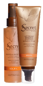Une gamme solaire prend place cette année dans les propositions de la marque Secret Professionnel. Elle comprend une huile sèche protectrice, à appliquer avant l’exposition, un shampooing corps et cheveux hydratant et un lait fondant, non gras, destiné à réparer la fibre capillaire après exposition au soleil. Ces produits sont riches en huile d’argan, pour son pouvoir hydratant et protecteur, en extrait de grenade, pour ses propriétés anti-oxydantes et anti-radicalaires, et en vitamine E, mais ne contiennent ni silicones ni parabens.
