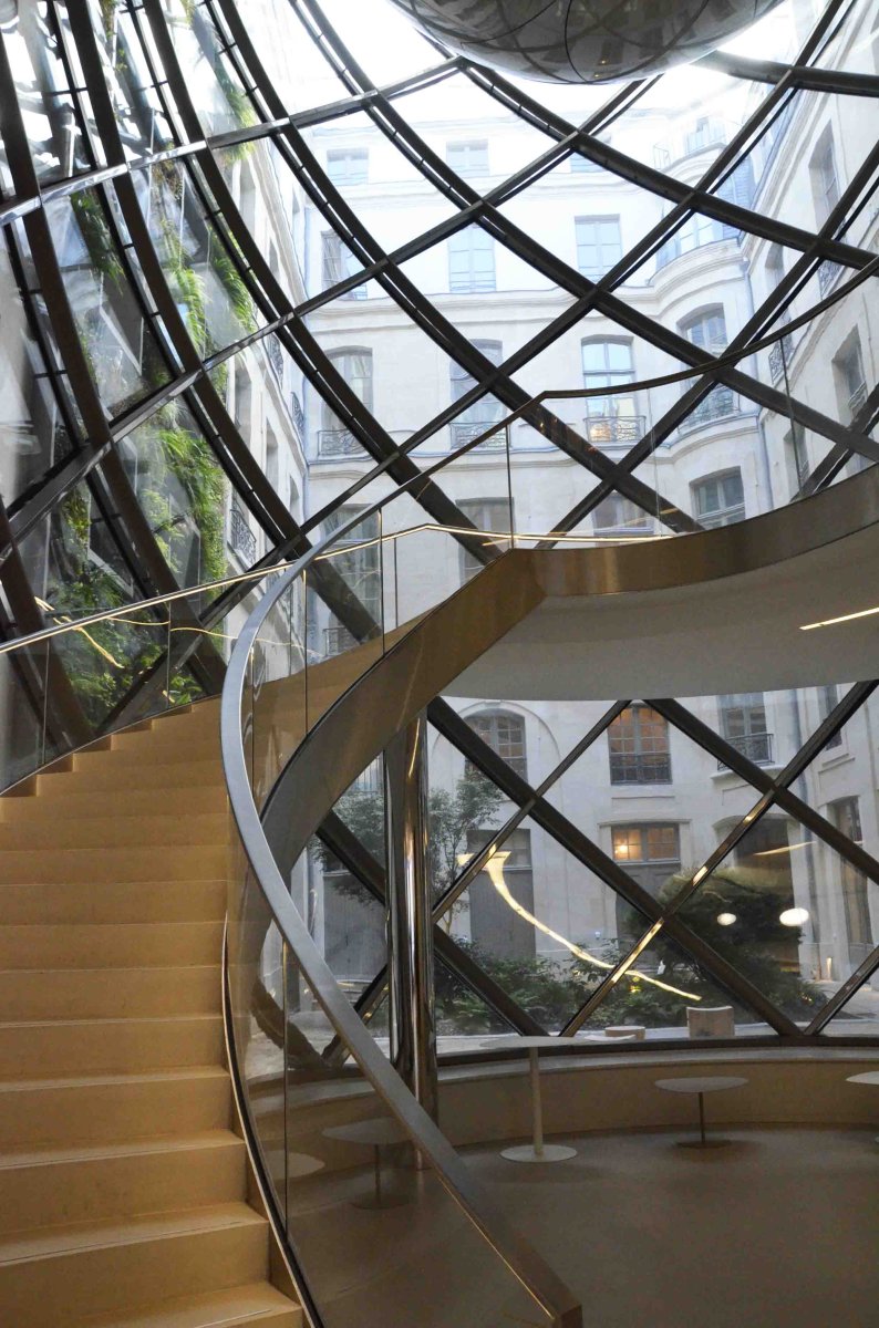 Il aura fallu atteindre 6 ans pour assister à la réouverture de 14 rue Royale, adresse emblématique du groupe L’Oréal depuis qu’en 1938 Eugène Schueller le créateur du groupe s’y était installé ! Si l’espace, rebaptisé « Le Visionnaire », est dédié aux presque 40 marques, le magnifique dernier étage reste aux couleurs des résidents historique, la division coiffure professionnelle, dans un immense salon et centre de formation de 750 m² ouvrant sur une pépite architecturale, le sommet de la tour de verre construite au centre de la cour !