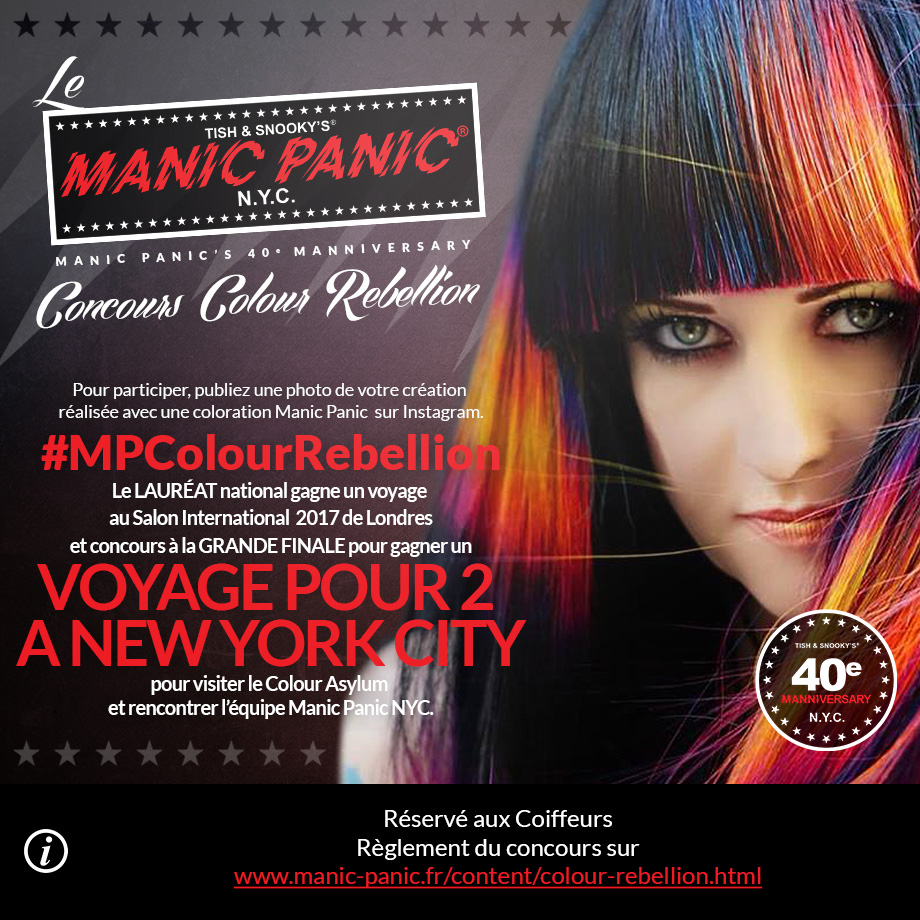 Pour fêter ses 40 ans, Manic Panic, marque américaine spécialisées dans les couleurs « déjantées », organise en France, au Royaume-Uni, en Espagne et en Italie un jeu concours réservé aux coiffeurs, Colour Rebellion. Pour participer, il faut poster sur Instagram une photo de haute qualité, avec une création réalisée avec une ou plusieurs colorations de la marque. Chaque coiffeur peut participer 2 fois. Date limite d’envoi des photos : le 30 août. Un gagnant par pays sera désigné (pour la France, son nom sera révélé le 17 septembre prochain, pendant le MCB by Beauté Sélection). Chaque gagnant national remporte une invitation à Salon International, qui se déroule à Londres du 14 au 16 octobre prochains. Et c’est pendant ce salon que le gagnant international (choisi parmi l’un des 4 gagnants nationaux) sera désigné par les représentants internationaux de la marque en Europe et de Manic Panic New York. Il remportera un voyage pour deux à New York (à effectuer début décembre 2017), pendant lequel il rencontrera notamment l’équipe new-yorkaise de la marque. Plus d’infos sur www.manic-panic.fr. En France, Manic Panic est distribué par Nathalie Calderini, qui a un salon à Nice.
