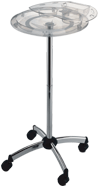 Une table pratique et originale avec emplacements pour pinceaux et distributeur de rouleau aluminium. Quatre pieds en acier chromé sur roulettes. Dimension : 50 cm x 91 cm. Disponible en coloris transparent, noir et rouge. Distribué par Car Diffusion.